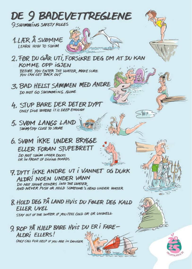 Det er i forbindelse med Friluftslivets år 2025 at vi nå vil oppmode til å finne fram badetøyet. Men bading kan være forbundet med en del farer så ser sett deg godt inn i de 9 badevettreglene på plakaten under.